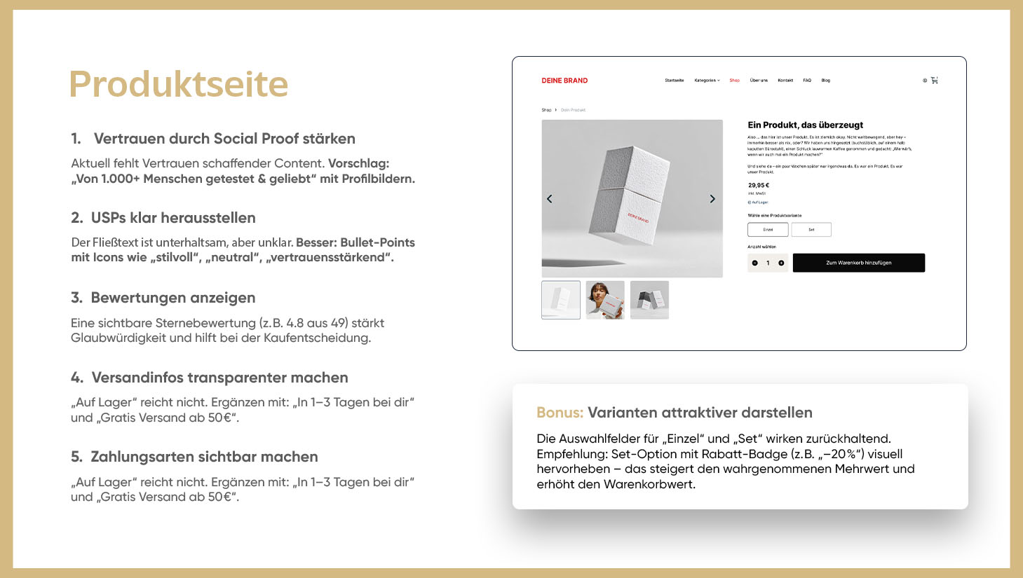 Du bekommst eine individuelle Analyse deiner Startseite, Kategorieseite und Produktseite. Dazu liefern wir dir 15 konkrete Optimierungstipps, visualisiert mit markierten Screenshots – wie ein Trainer, der über deine Schulter schaut und sagt: "Hier verlierst du gerade Umsatz – und so änderst du das."